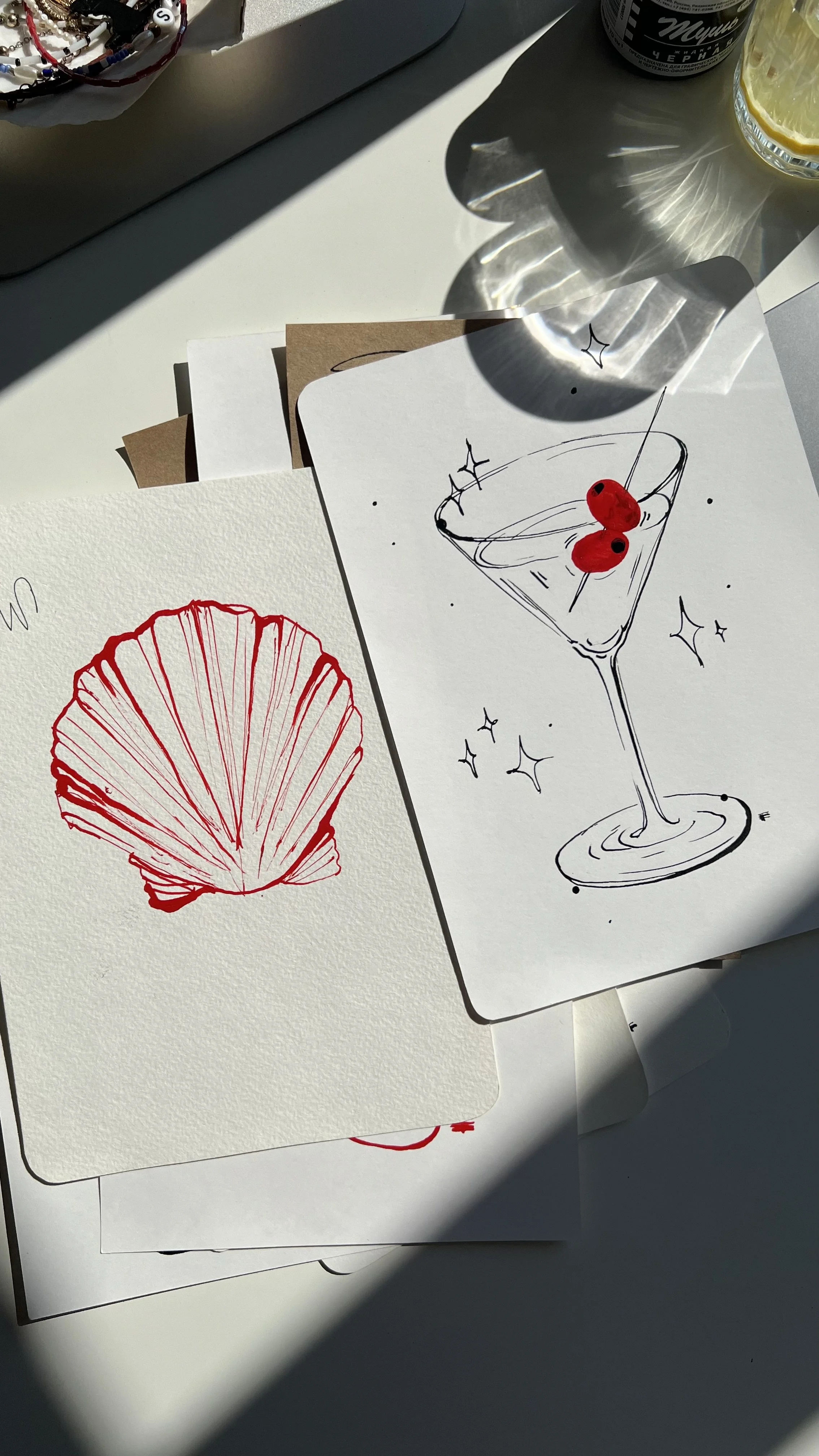 These illustrations treat souvenirs of life—a Martini on a date, hotel keys mid-journey, a found shell—as characters. Minimal lines and color trace the moods they remember.